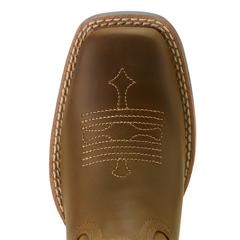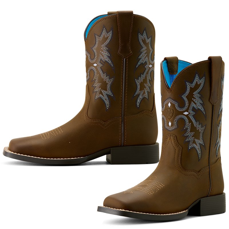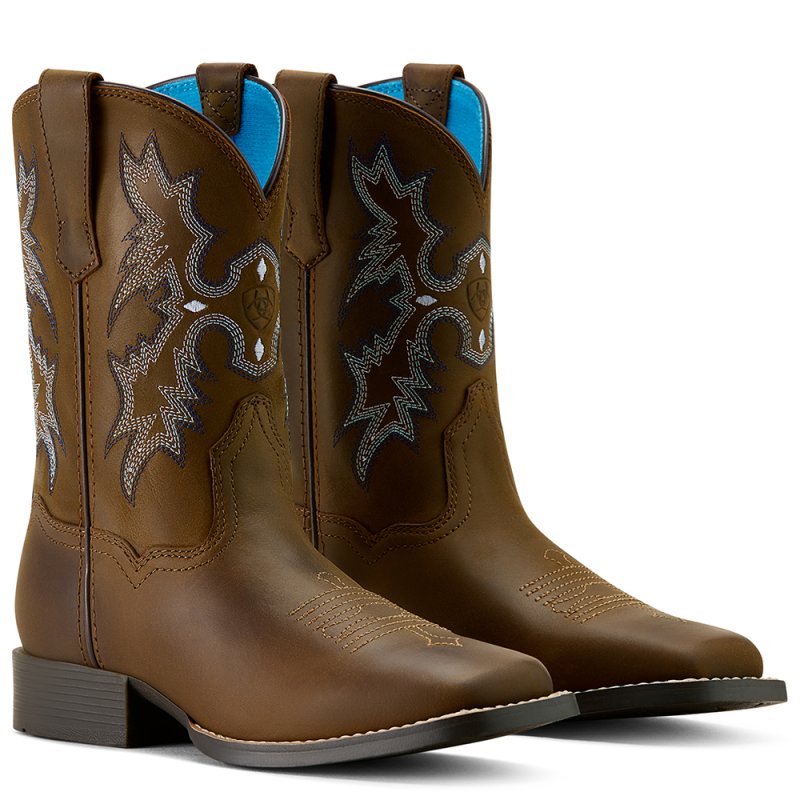 This Ariat Tombstone Boot for kids is a children's performance riding boot—the cowboy boot features 4LR Technology, along with a durable TPR outsole. The 4LR Technology provides your child with support and cushioning through its four-layer footbed and lightweight stabilizing shank, which offers additional support. The TPR outsole is a lightweight, molded thermoplastic rubber compound that provides durability and flexibility, along with cushioning and rebound, while also resisting maximum wear. This western boot also comes with a removable Booster Bed for ever-growing feet. The premium full-grain leather features a four-row stitch pattern with blue colors and a cross pattern. The kids' Ariat Tombstone square-toe boots are proven favorites!