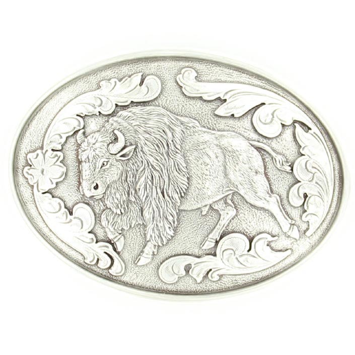 Nocona mens western buckle features a silver smooth edge oval shaped buckle with a buffalo and floral scroll on each side of it.